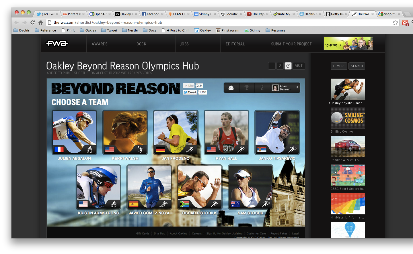 MISSION: Win the Oakley business by demonstrating how social media can both promote the new Beyond Reason campaign and the Olympic athletes Oakley is sponsoring. RESULT: BUSINESS WON and Oakley commissions the creation of the Beyond Reason Olympics Social Hub, the idea conceived for the pitch.