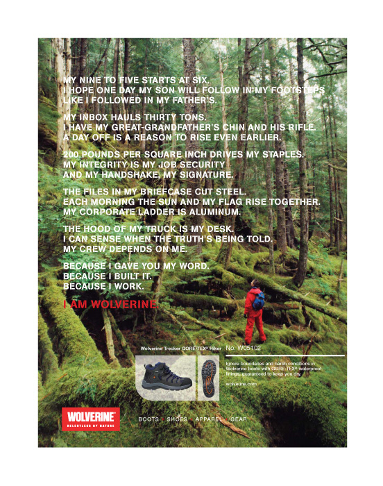 MISSION: Win the Wolverine business by creating a powerful brand campaign that extols the virtues of the blue collar work ethic. RESULT: BUSINESS WON and pitch work became the new brand campaign.